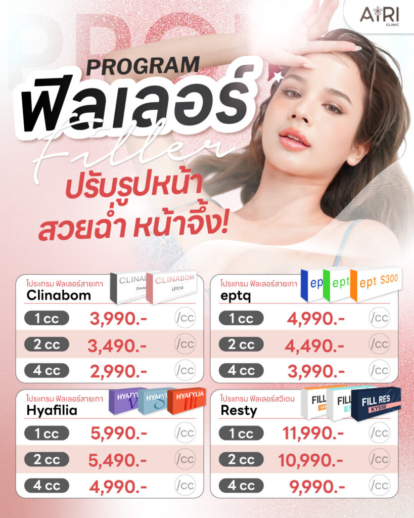 ปัจจุบันโปรแกรมที่กำลังเป็นที่นิยมในคลินิกความงาม คือ โปรแกรมฉีดฟิลเลอร์ ที่ช่วยปรับรูปหน้าด้วยสารเติมเต็ม เพื่อให้ใบหน้าดูสวยละมุนมากยิ่งขึ้น บริเวณที่นิยมฉีดฟิลเลอร์แล้วหน้าเปลี่ยนได้แก่ ฟิลเลอร์ปาก ใต้ตา คาง ขมับ ร่องแก้ม และที่ไอริคลินิกก็ให้บริการโปรแกรมฉีดฟิลเลอร์มาอย่างยาวนาน พร้อมเสริฟรีวิวมากมายให้แก่ลูกค้าทุกท่าน